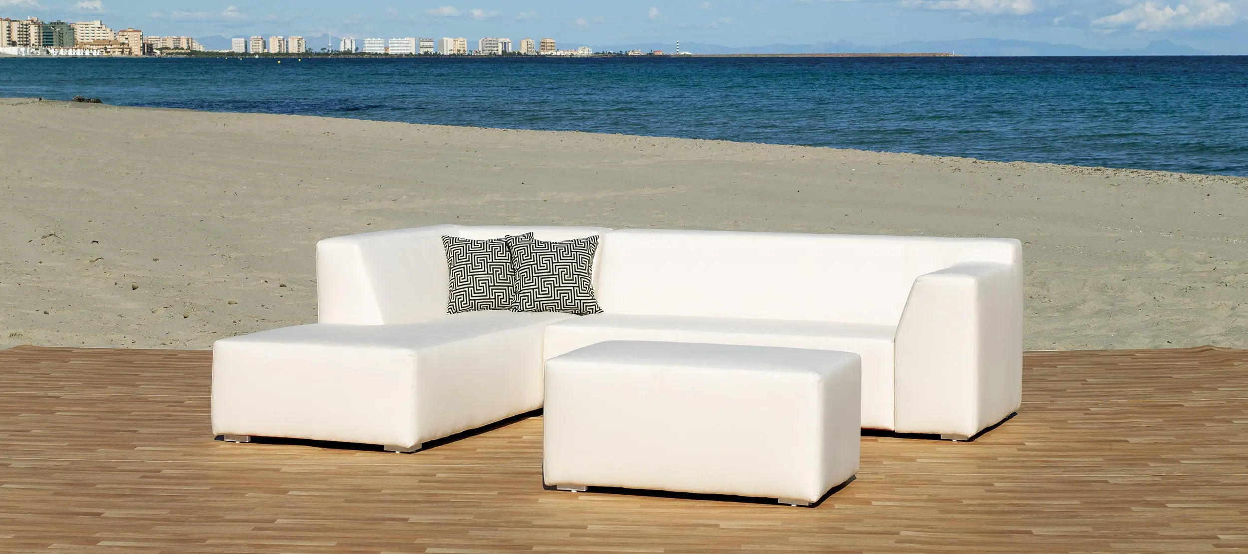 - Chaise longue para 3/4 plazas con estructura de aluminio. Asientos y respaldos acolchados con goma espuma y guata tapizados con tejido impermeable. dividida en dos módulos separables: