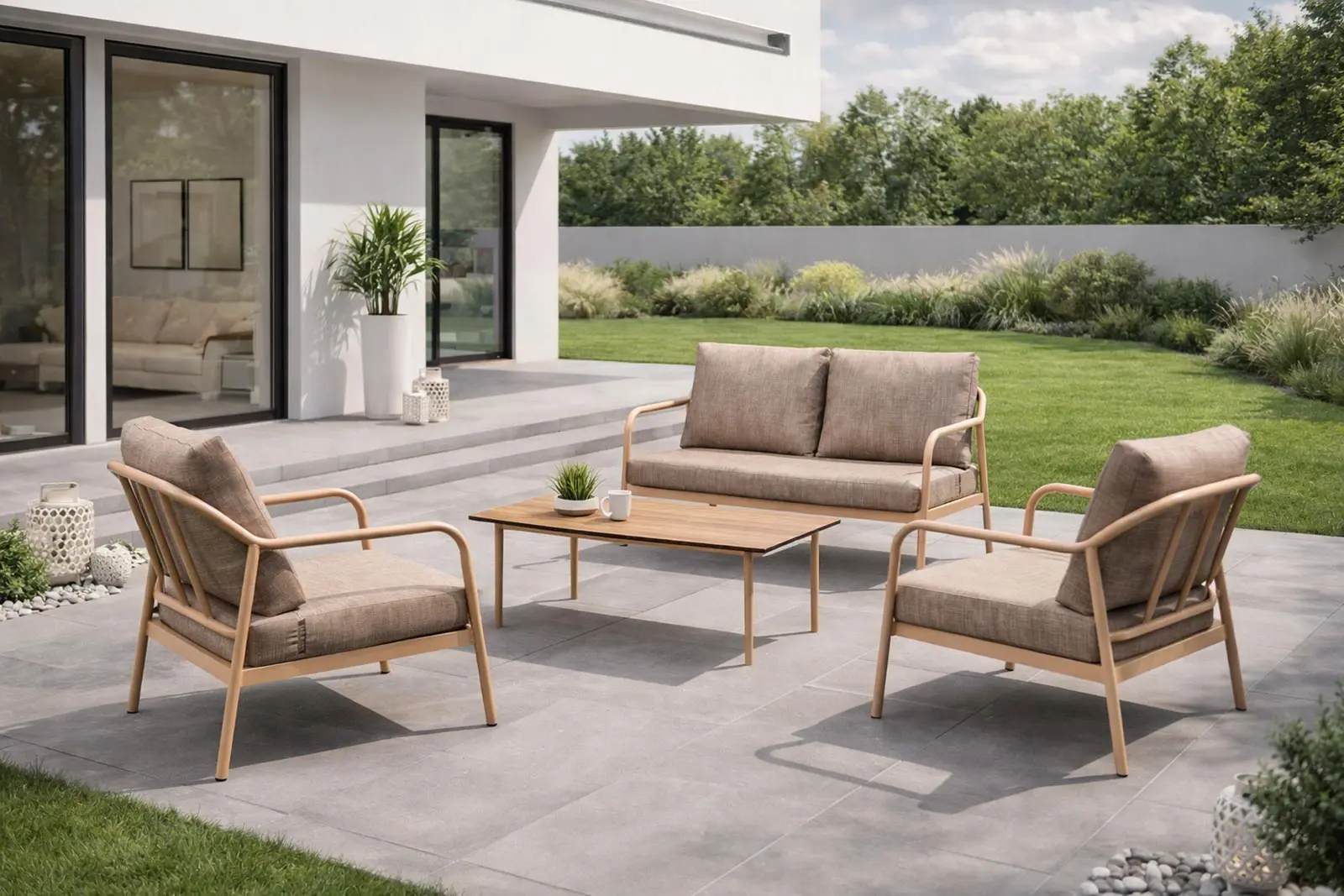 Este conjunto de 4 plazas ha sido diseñado para aprovechar cada metro cuadrado de tu zona exterior. Incluye un sofá principal, dos sillones individuales y una mesa auxiliar de generosas dimensiones; 120 x 60 x 40 cm, perfecta para tus cenas informales o para apoyar tus libros favoritos. La proporción de las piezas sigue una estética equilibrada que no recarga el ambiente, manteniendo esa sensación de amplitud y orden que caracteriza a los hogares más elegantes.
