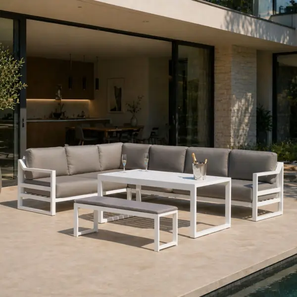 La estructura está fabricada en aluminio de alta calidad, un material especialmente indicado para exteriores por su resistencia a la corrosión, su ligereza y su durabilidad. Esto garantiza un excelente comportamiento frente a las condiciones climáticas y un uso intensivo sin deterioro. El conjunto incorpora cojines de alta densidad que proporcionan una sentada cómoda y estable. Los tejidos técnicos utilizados están preparados para resistir la exposición solar, la humedad y el uso continuado, facilitando su mantenimiento y prolongando su vida útil.