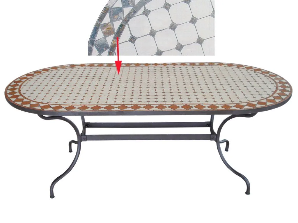 Esta mesa mosaico ovalada de elegante diseño, creará un ambiente mediterráneo en tu hogar. Su patrón de mosaico, de figuras geométricas, hecho a mano es particularmente único y le darán un estilo personal a tu terraza o jardín.