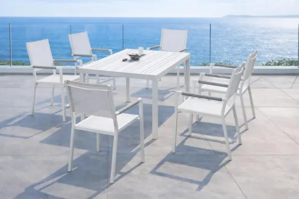 Hace unas semanas les compré un banco para la terraza y estoy muy contento con el resultado. El color blanco del aluminio se mantiene impecable incluso con el sol y la lluvia. Es robusto, muy cómodo (con el cojín queda ideal). Lo recomiendo por su calidad.