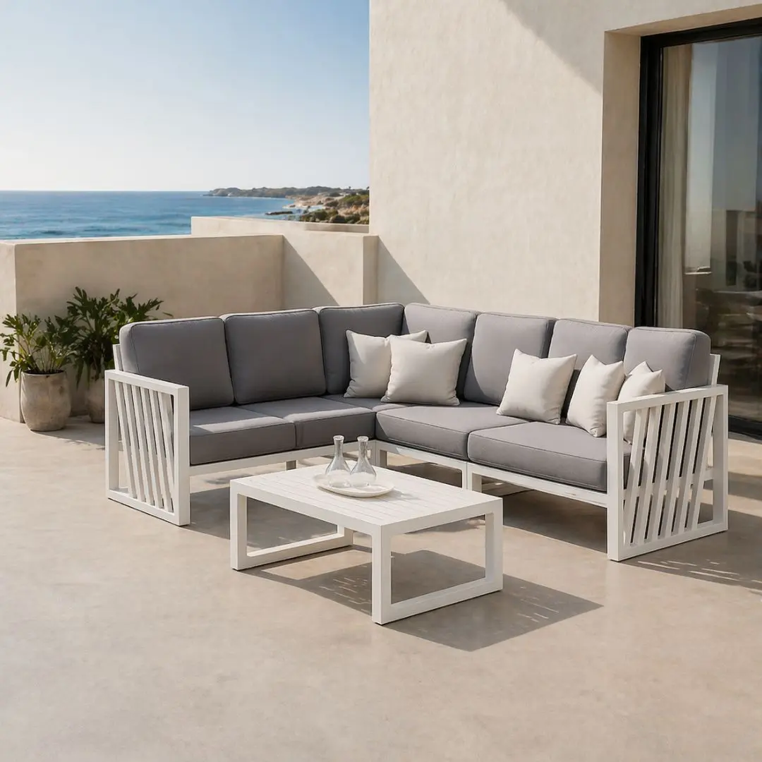 El set muebles exterior lujo Abigueil está diseñado para quienes buscan elevar el nivel de sus espacios exteriores con un conjunto que combina diseño sofisticado, confort superior y materiales preparados para un uso exigente. Su estética elegante y atemporal lo convierte en una pieza clave para crear ambientes exclusivos en terrazas, jardines o proyectos contract de alto nivel. La estructura de aluminio aporta ligereza visual sin renunciar a la resistencia, ofreciendo un comportamiento excelente frente a la humedad, la corrosión y la exposición continuada al sol. Este equilibrio entre robustez y diseño permite disfrutar de un mobiliario duradero que mantiene su aspecto impecable con el paso del tiempo.