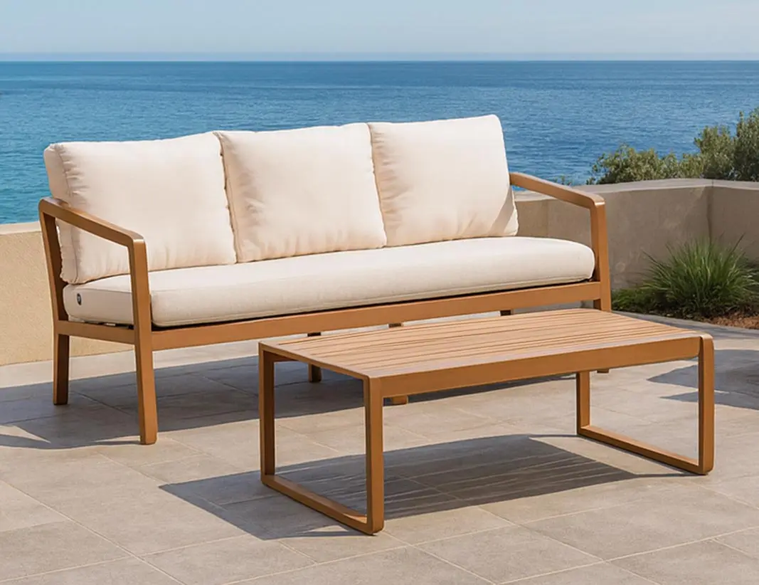 Si buscas darle un toque de lujo a tu terraza sin preocuparte por el mantenimiento, este sofá de diseño minimalista es tu mejor aliado. Está fabricado íntegramente en aluminio de alta resistencia, un material que destaca por ser extremadamente ligero y, lo más importante, inoxidable. A diferencia de otros muebles de exterior, este no pierde su color ni se deteriora con la humedad o el salitre.